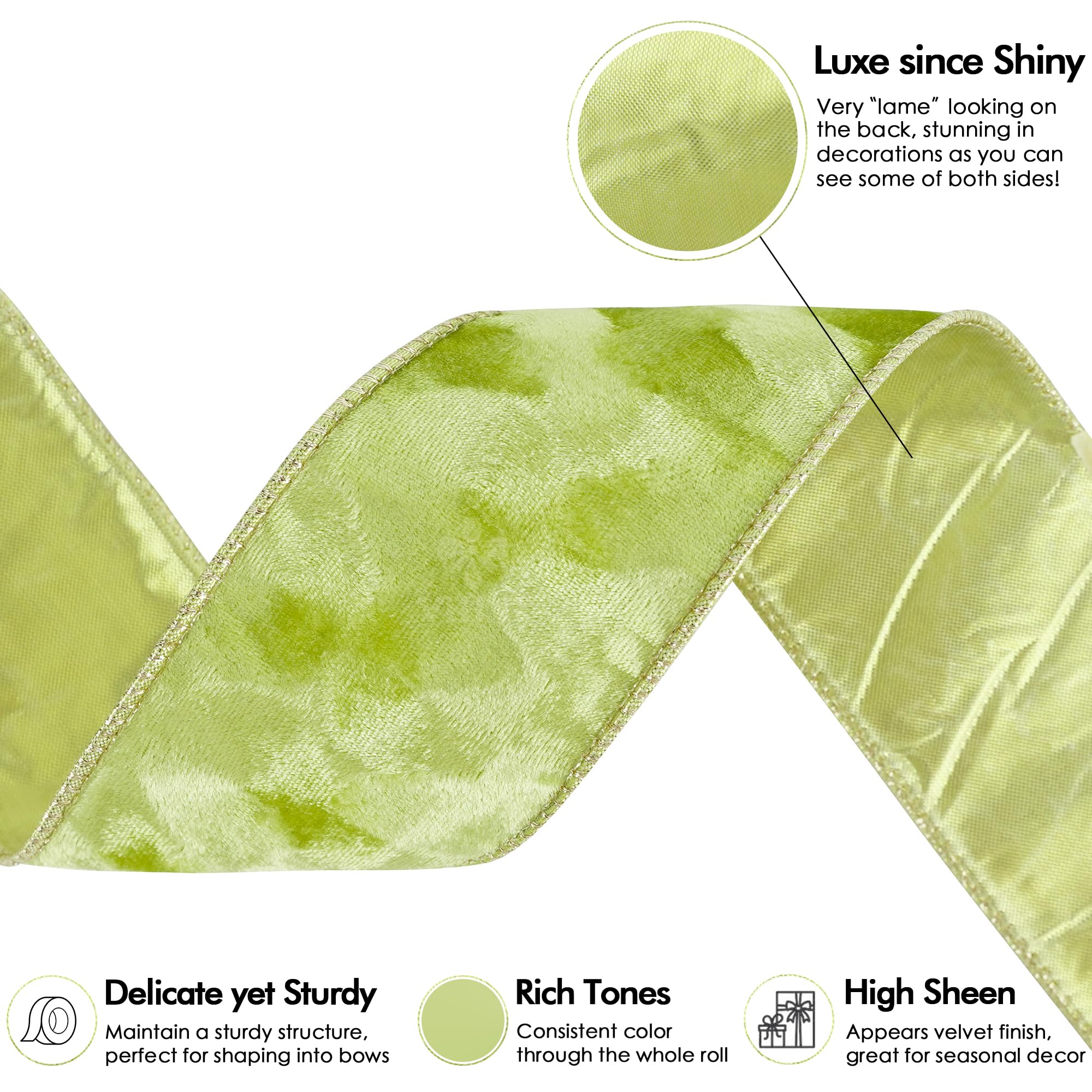 - Our exquisite velvet Christmas ribbon features moss green crushed velvet on one side and a gold back on the other, creating a stunning contrast and a touch of opulence. Measuring 2.5 inch in width and 10 yards in length, it elevates your holiday decorations with its luxurious texture. Thanks to its wired edges, it’s perfect for crafting bows, gift wrapping, wreaths, and seasonal décor.