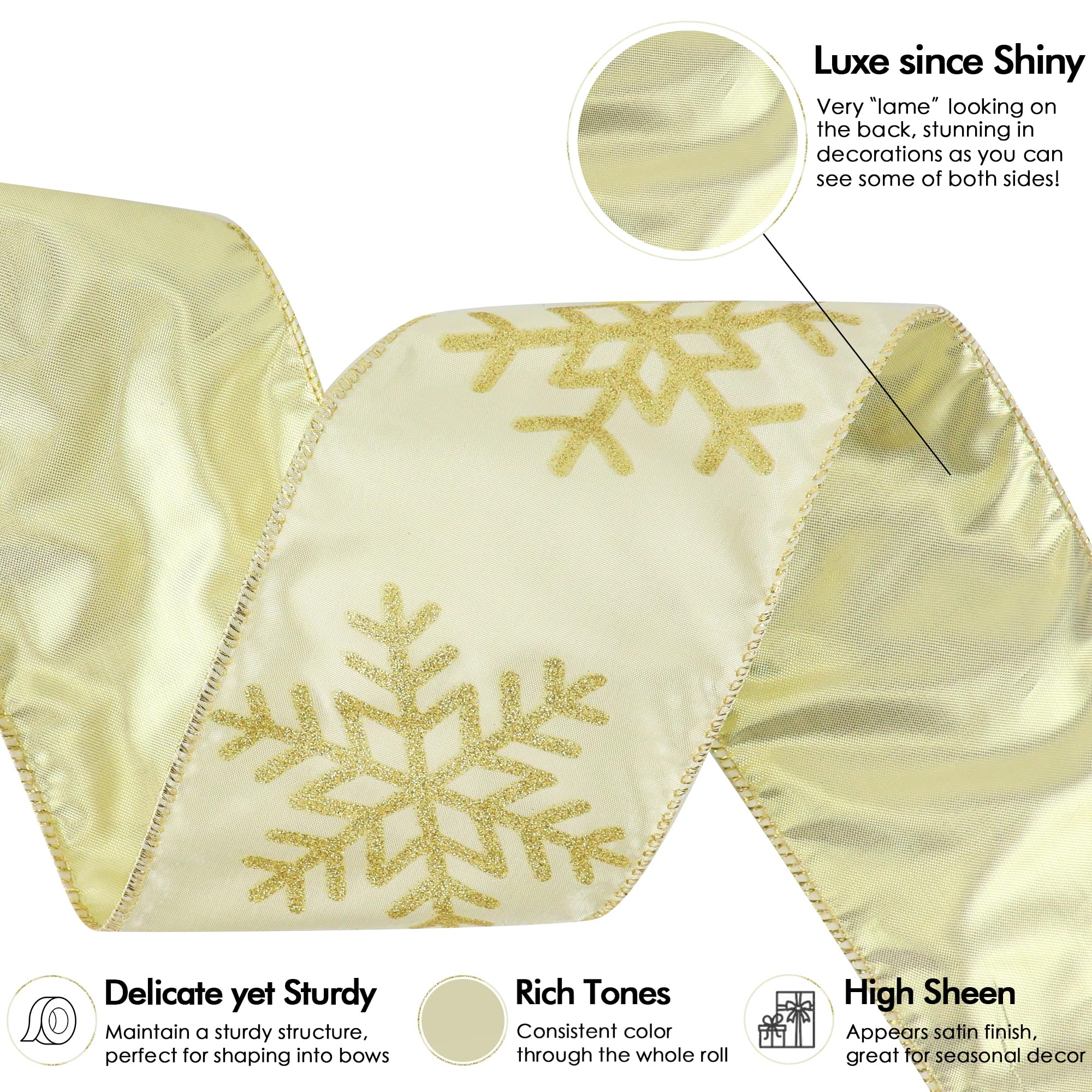 - Our glittery Christmas snowflake ribbon is 4 inches wide and features a gold snowflake design running the full 10 yards (approximately 30 feet). With gold metallic wired edges, it holds its shape beautifully when tied or bowed, making it ideal for gift wrapping, wreaths, and seasonal decorations.