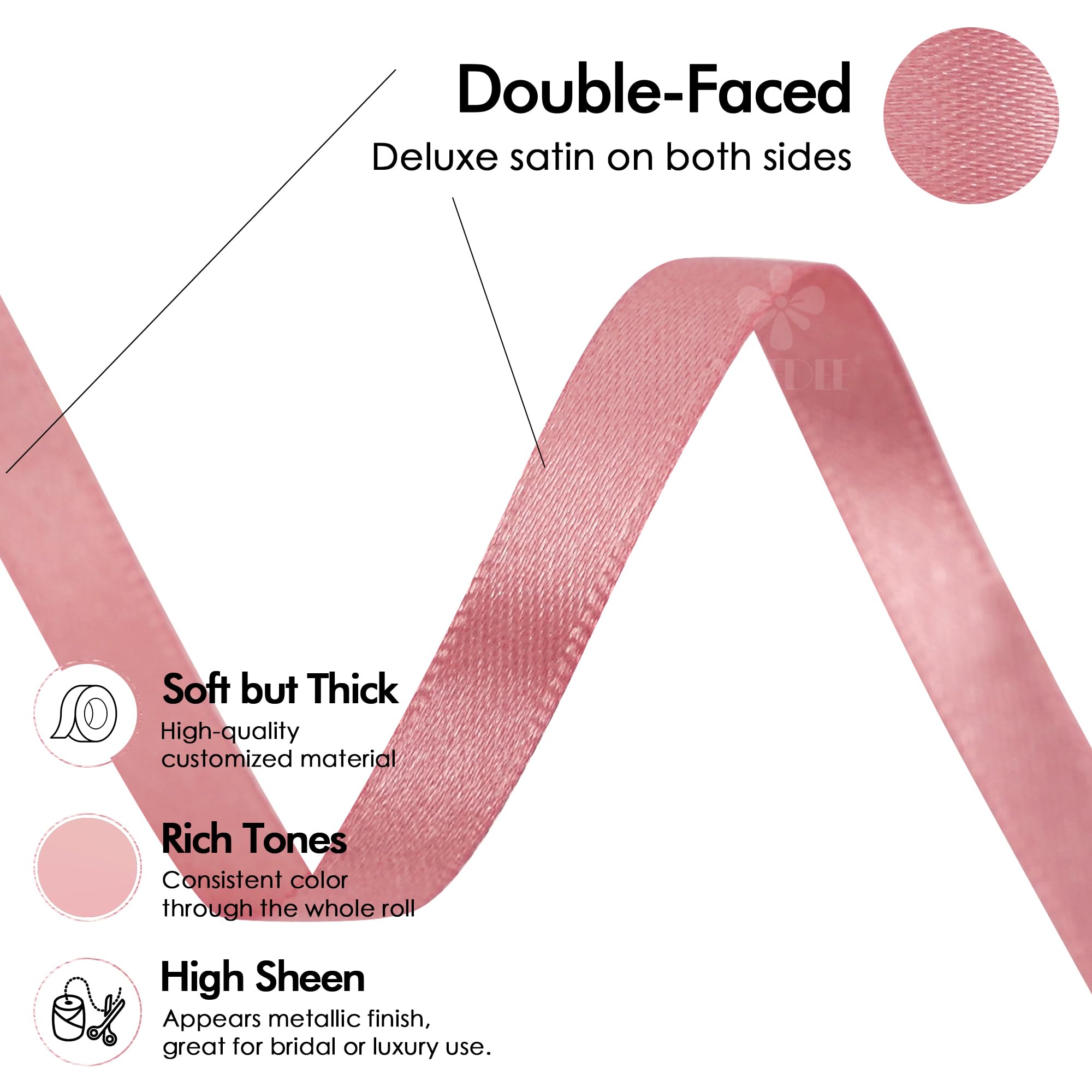 - Feeling Like Silk: Our satin ribbon is crafted from 100% high quality polyester, offering both elegance and durability. Though not metallic, its exceptionally high sheen creates a radiant, almost metallic like effect. The smooth yet soft surface enhances its luxurious look while ensuring ease of use. Unlike single-faced satin, our double-sided design provides a polished appearance from every angle.