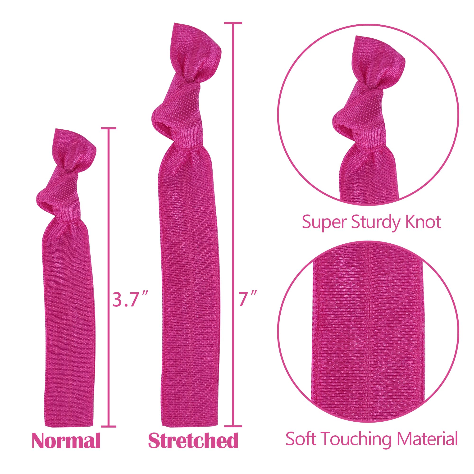 - Our fuchsia pink package contains 100 pack solid color hair ties. Our hair ties are made of very soft fold over elastics with a satin look finish. Each hair tie measures approximately 3.7 inches in length (including the knot), when laid flat, allowing you to store an unused band comfortably on your wrist.
