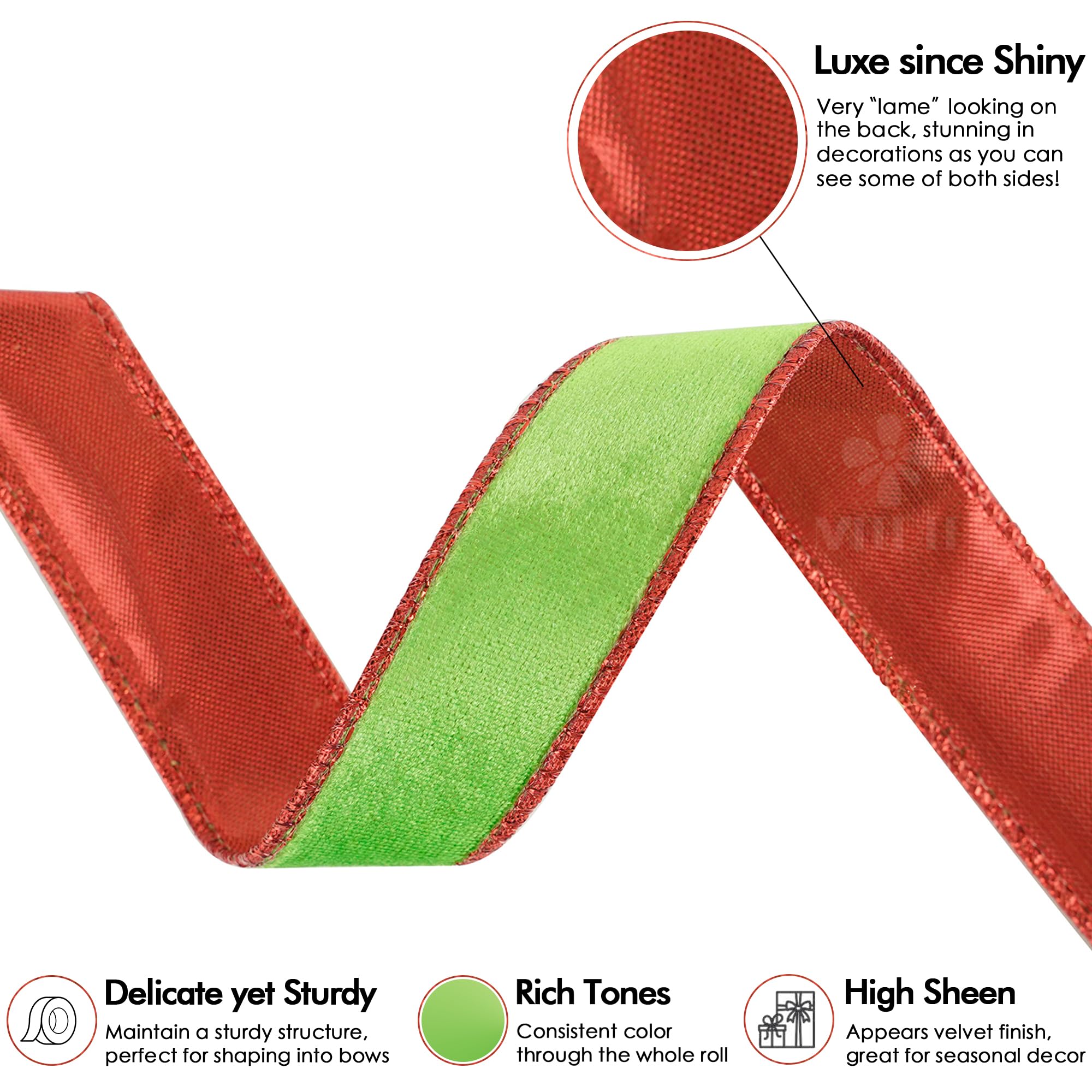 - Our exquisite velvet Christmas ribbon features lime green crushed velvet on one side and a red back on the other, creating a stunning contrast and a touch of opulence. Measuring 1 inch in width and 25 yards in length, it elevates your holiday decorations with its luxurious texture. Thanks to its wired edges, it’s perfect for crafting bows, gift wrapping, wreaths, and seasonal décor.