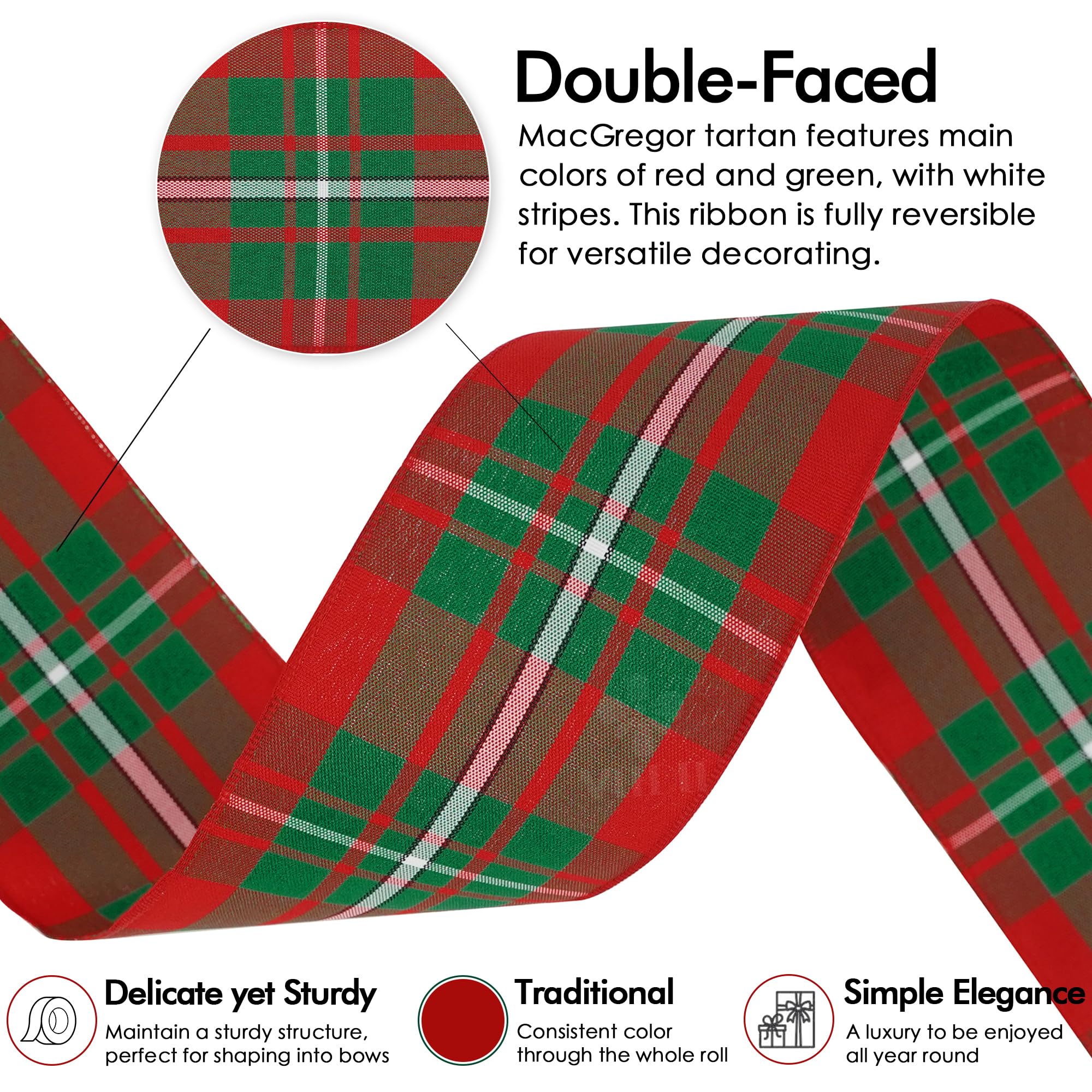 - [ MACGREGOR TARTAN ] Bring timeless Scottish tradition to your crafts with this 2.5 inches wide and 25 yards long wired ribbon in the classic tartan pattern. Featuring main colours of red and green, with white stripes, this authentic plaid design is deeply rooted in heritage. Crafted from high-quality polyester, it is perfect for gift wrapping, décor projects, wreaths, and DIY crafts.