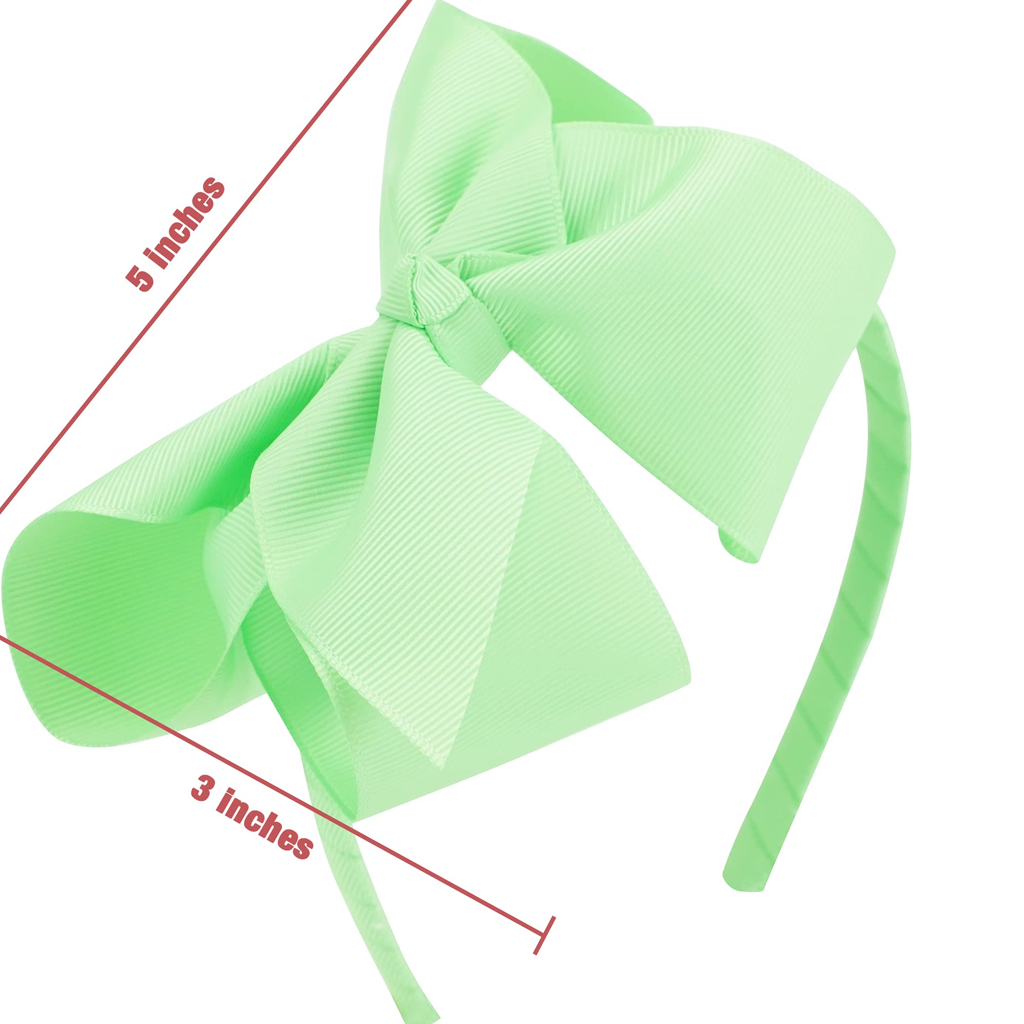 - Package comes in: 1 PCs APPLE GREEN big bow headband, approx size: 4.7" x 5.3" (L*W), bow size: 5" x 3" (L*W). Large grosgrain boutique bow on a grosgrain covered hairband. The size " large " indicates the bow size and not the hairband size. Our ribbon used is OEKO-TEX approved and the hairband contains no metal.