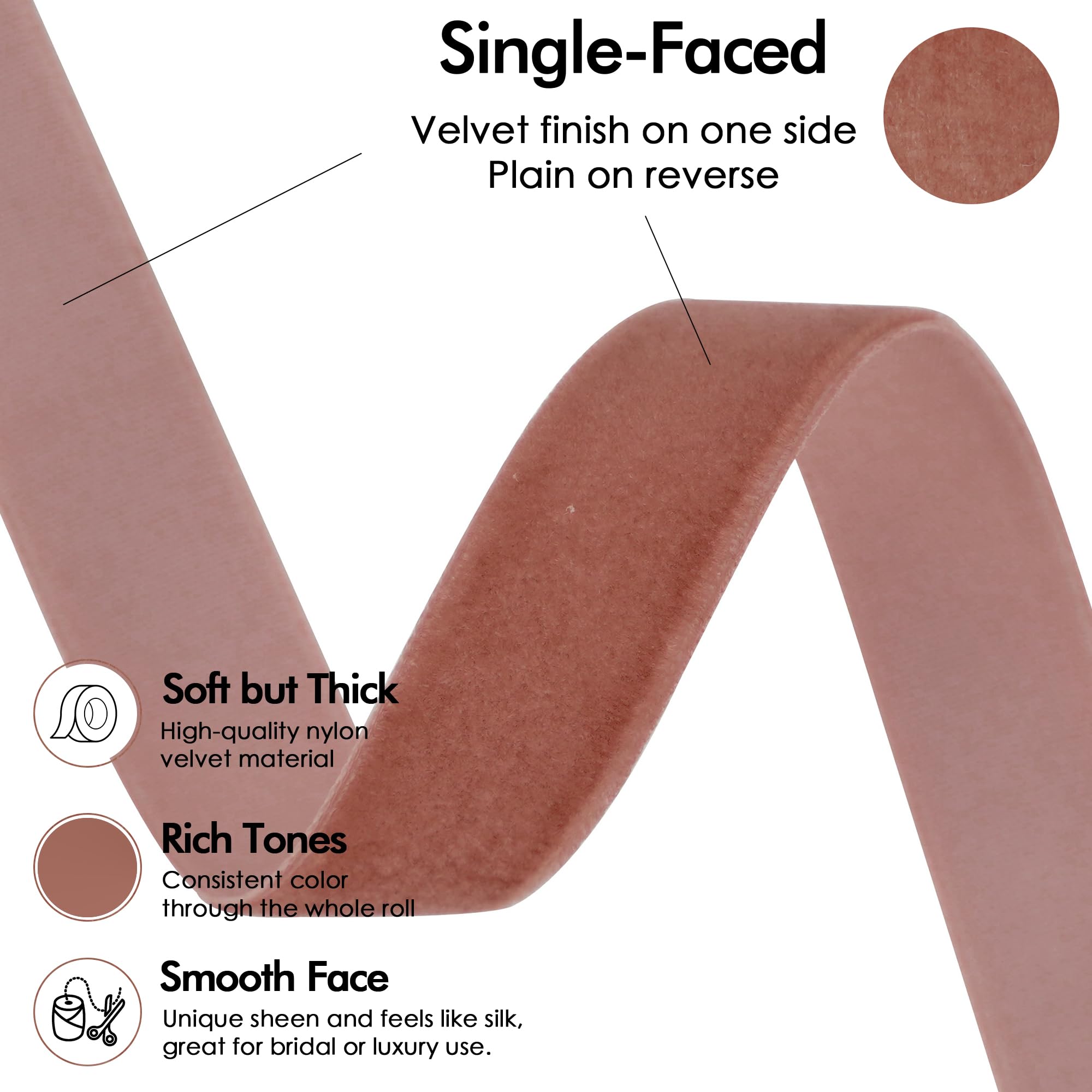 - Elevate your crafting and gift wrapping with our luxurious 5/8 inch wide, 25 yards long nylon white single-faced velvet ribbon. This exquisite ribbon boasts a soft, plush texture that adds a sophisticated touch to any project, whether it's for seasonal decorations or special occasions. The rose gold color enhances the elegance of your creations, making it a perfect choice for weddings, anniversaries, and holiday festivities.